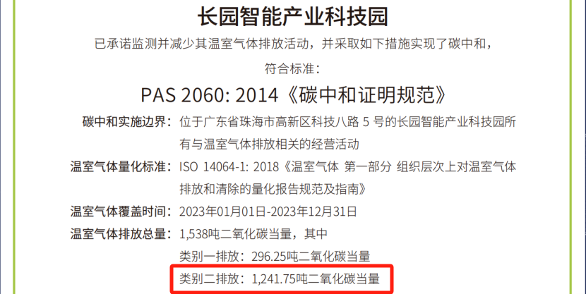 本次园区碳中和的实施,由710公海寰宇科技集团旗下子公司710公海寰宇综合能源(深圳)有限公司(简称“710公海寰宇综能”)根据国际标准ISO 14064-1:2018《温室气体-第一部分 组织层面上温室气体排放与清除量化及报告规范》对园区类别1、类别2温室气体排放量进行了核算并出具核算报告,由中国合格评定国家认可委员会(CNAS)授权的第三方核证机构华测检测(CTI),按照ISO 14064-3《温室气体声明审定与核查的规范及指南》对核算报告进行了核查,并根据PAS 2060《碳中和证明规范》对碳中和结果进行了认定。